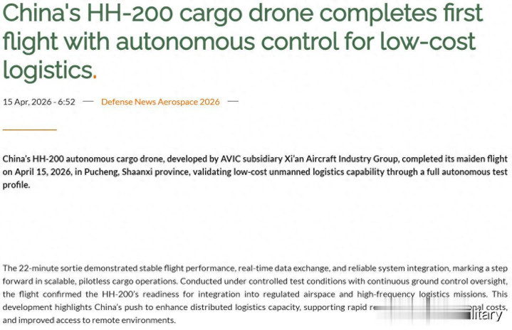 2026年4月15日,由中国航空工业集团旗下西安飞机工业集团研发的HH-200自主货运无人机在陕西蒲城完成首飞。本次飞行通过完整的自主测试流程,验证了低成本无人物流能力。